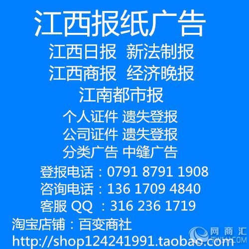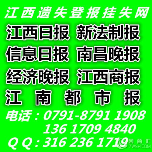 江西报纸、南昌报纸广告服务办理中心 江西报纸公告,声明类广告刊登办理 本公司为江西《江西日报》《新法制报》《江南都市报》《江西商报》等江西省市级强势媒体分类版面广告代理. 专业承办: 1 、遗失声明:(个人证件遗失,公司证件遗失声明 票据遗失公告) 2、注销公告:公司注册号注销 3、减资公告:公司注册资本减资 4、歇业公告:公司歇业 5、清算公告:公司清算 6、启 事:寻人、寻物、讣告、通知 7、招投标公告 银行债权催收公告 拍卖公告 土地出证公告等 以上内容可在江西的《新法制报》、《江西日报》、《江南都市报》、《信息日报》 等各大南昌市级报纸上刊登! 本公司可保证刊出的公告工商局,公安局、法院等系统承认有效! 附:本公司为《江西日报》、《江南都市报》、《新法制报》分类广告代理 本公司为《江南都市报》招生专版、招聘专版广告代理 江南都市报青山湖区广告办理点 江南都市报软文广告办理热线 江南都市报中缝广告办理电话 江南都市报婚介广告办理登报 遗失登报的作用: 一、遗失者按法律规定刊登声明之后,即推定社会上不特定的所有人都应当知道该证无效,登报作废是以较广泛的传播方式,向社会公众公示声明内容;即解除了遗失者的社会责任; 二、通俗来讲,就是他人再冒用该证而产生的各种后果,对该被丢失证件在公示后被人使用产生的法律后果不承担责任; 三、登报声明作废后可以依法去相关部门补发证件; 四、遗失声明一般要求在公开发行的报刊上刊登才有效,网络发布是无效的,不具有遗失声明的法律效力。 遗失声明公告注销登报联系方式广告部: