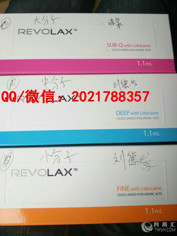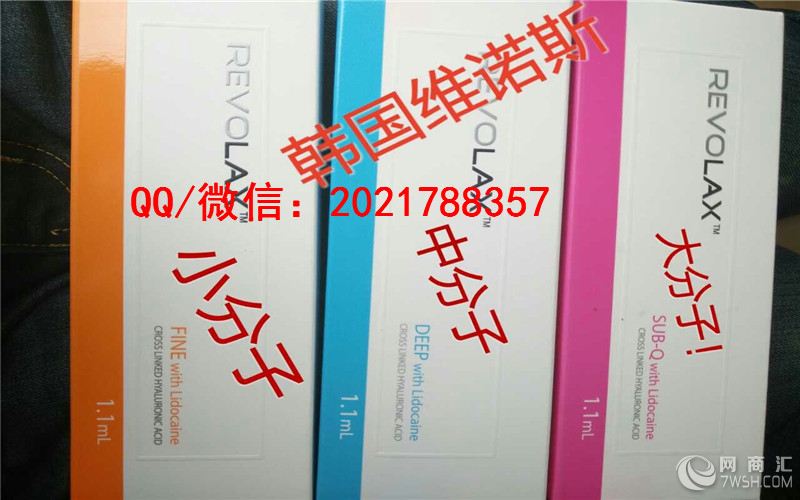 供应各种玻尿酸、美白针、减肥溶脂针、青春素、抗衰老人胎素胎盘素,除皱紧肤产品、原装进口厂家直销物美价廉! 需要了解请联系我们扣扣/微信: 2021788357 韩国Revolax维诺斯玻尿酸 Revolax是一款交联型玻尿酸软组织填充剂。通过向面部注射一定量的Revolax产品,达到去除面部皱纹,恢复面部光滑容颜。 使用范围:颈部细纹,法令纹,丰脸颊,丰唇,丰下巴,鼻型塑造 注射深度:真皮的深层,皮下组织中间层 韩国维诺斯玻尿酸。一盒一支,一支1.1ml。玫红色SUBQ(大分子)适用于鼻子,下巴,蓝色DEEP(中分子)适用于苹果肌,法令纹,太阳穴,脸颊,额头及深度皱纹。橙色FINE(小分子)适用于唇部,口周纹,木偶纹,眉心纹,鱼尾纹等。
