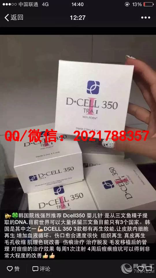 供应各种玻尿酸、美白针、减肥溶脂针、青春素、抗衰老人胎素胎盘素,除皱紧肤产品、原装进口厂家直销物美价廉! 需要了解请联系我们扣扣/微信: 2021788357 韩国D-CELL350干细胞婴儿针 D CELL容量:2.2ml *5瓶装 用法用量:每周一次或每隔4天一次使用半瓶,可使用10次。(10次一疗程) 所谓PDRN,是鲑鱼提取物制成的一种成分和注射剂,它有效治疗痘印,特别是治疗凹痕很有效。去妊娠纹、祛疤祛痘印、细致毛孔 [鼓掌] DCELL 350 3款都有再生效能.让皮肤内细胞再生 增加血液循环,伤口愈合速度很快 。 DCELL 350 TRA I 再生款特点:组织再生 真皮再生毛孔收缩 肌理改善 伤痕治疗 治疗脱发 毛发移植后的管理 对痘痘的治疗效果每周1次注射 4周后痘痕痘坑可以得到非常大程度的改善。 2? DCELL 350 TRA W美白款特点:添加了胎盘提取物色素沉着治疗PIH 镭射治疗后过敏变薄红血丝皮肤美白作用雀斑红斑黑眼圈黑色素等。 3? Dcell350 H补水修复款特点:含有12%ha玻尿酸。补水效果特别明显。韩国著名皮肤医院丽得姿称dcell H 超级水光。比目前市面上玻尿酸补水效果过几十倍。
