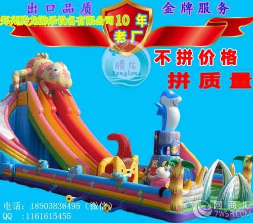 郑州腾龙游乐设备,致力于充气水池,充气沙滩池,充气城堡,充气滑梯等大型充气玩具,以及电动儿童玩具、充气广告媒体等多元化系列游乐设备产品的生产和销售,产品行销全国各地,并出口到澳洲、南美、加拿大,韩国、中东等国家和地区,用我们优异的产品和良好的服务,赢得了广大客户的认可和信赖。 本产品适合于公园、小区广场、城市广场、旅游景点、大型商场、百货公司等投资经营、低成本高回报,是您小本创业投资的好项目。根据我们的调查和客户反应,一座充气城堡一天一般都有近五百元的收入,若放到好的地方,一天都有近千元的收入。一经投放市场,引来不少哄动,大批小本投资者奔走相告。