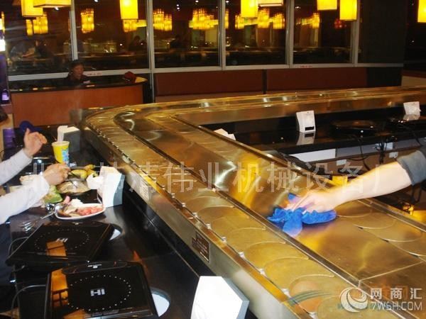 回转自助寿司设备主要用于日本料理、韩国料理、西餐厅及自助餐厅等等,速度为0-5米/分钟可调节,链板为特制月牙形不锈钢链板,其设备安装后,业主可根据自身情况可进行装修,客人用餐台面可用大理石或实木装修,设备还可根据业主餐厅布置的要求,来做不同形状,其价格合理,外观精美,无噪音等特点。火锅线,旋转寿司线,旋转火锅线结构概要: