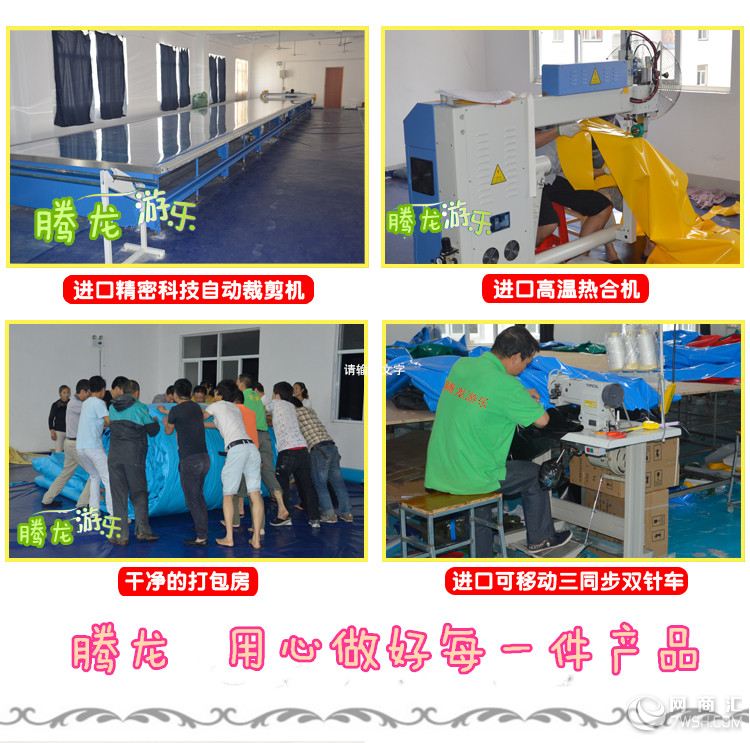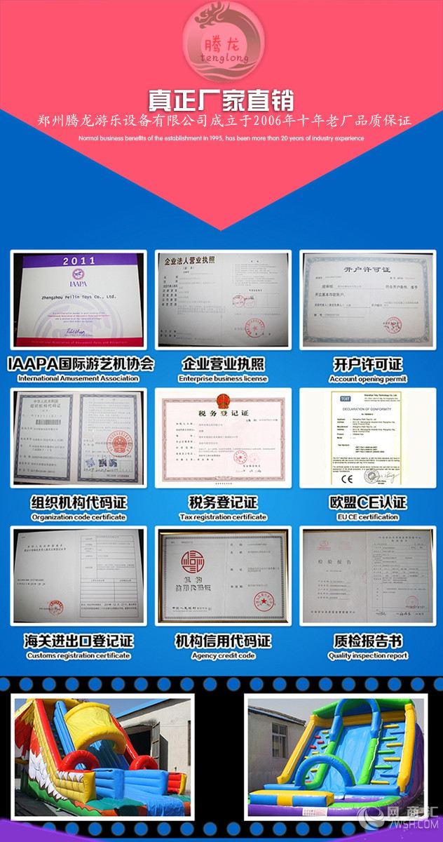 郑州腾龙游乐设备有限公司 品 名:充气城堡 品 牌:郑州腾龙游乐设备 产品造型:可自选,设计师量身设计 经营场地:广场、游乐园、公园、集市、商场等 场地条件:较平坦、无尖利物 设备配置:风机750W——1100W,220V 材料参数:厚度0.45-0.55mm 材料性能:采用进口技术生产,光滑彩色面料制作,耐寒(可达零下40度)耐晒(60度)。 使用年限:100000人次 人员配置:每件1-2人 适龄儿童:3岁-16岁 产品质量:20-65kg; 充气时间:3-5分钟 停机排净空气时间:10-15分钟 折叠所需时间: 5-10分钟 售后服务:1、保修三年,终身提供维修用的胶水和维修材料 2、凡购买我公司充气类产品的客户,将给予终身的技术支持 3、腾龙游乐及时为你解答疑难技术问题 大型充气玩具相关知识 材 料:加网PVC布料,由质量监督局检测结果显示此材料对皮肤无刺激性,无毒性对儿童完全没有伤害。此材料为一种专业的充气布,耐寒性好,可达零下40度低温;阻燃性好。 相关配件:配送相应风机,胶水和修补材料。 使用寿命:可使用八至十万人次左右 2016年新款充气玩具,儿童充气城堡“猪猪侠”系列规格:10X6 10X5 大滑梯系列规格有12*6 12*7 15*8 16*9 18*10 20*10 也可以根据可以场地要求定制 售后服务 :三年内免费提供维修用的胶水和角料,我公司售后服务人员将及时为您解决疑难问题,收到客户信息后,即时给予客户一个处理意见或技术指导不能即时处理的,将在24小时内与客户联系并根据实际情况提出处理意见。 是国家质量监督检验检疫总局对企业原材料的选用,产品外观,结构设计,生产工艺,质量控制体系,服务体系,管理制度等各个生产环节的一种合格认证。 热线电话:18237898804 QQ::974165998