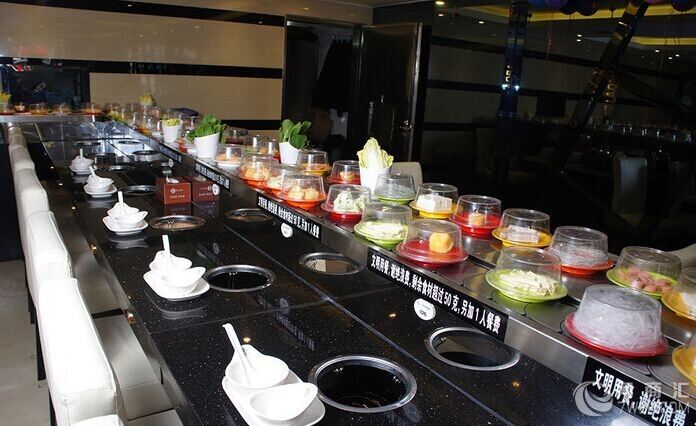 十堰性价比高的自助旋转火锅设备 回转自助火锅设备是创业的 主要用于日本料理、韩国料理、西餐厅及自助餐厅等等,速度为0-5米/分钟可调节, 链板为特制月牙形不锈钢链板,其设备安装后,业主可根据自身情况可进行装修, 客人用餐台面可用大理石或实木装修,设备还可根据业主餐厅布置的要求,来做不同形状, 其价格合理,外观精美,无噪音等特点。链板及链条均采用304磨沙面冲压而成,板厚1.8mm,宽度140mm,链条节距100mm, 链条下部分导轨面板采用304锈钢镜面,板厚度为1.2mm,内部采用白色防摩尼龙垫条,旋转吧台, 寿司料理,旋转火锅,自助火锅餐厅。下架采30mm*30mm*1.5的碳钢方管焊接而成,表面经过防锈处理, 所有连接部分均采用标准件连接,便于移装。 十堰性价比高的自助旋转火锅设备 回转自助火锅设备是创业的