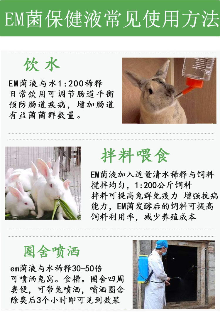 3、圈舍除臭消毒:养兔专用EM菌加水30-50倍稀释,喷洒兔子窝、食槽、圈舍四周、粪便、除臭味降氨气,改善养殖环境,EM菌保 健液是微生物制剂,可以带兔喷洒,长期使用可以抑制 减少病原微生物和细 菌的增生,减少发病率,减少用药成本。详细情况可来电咨询:18625525214