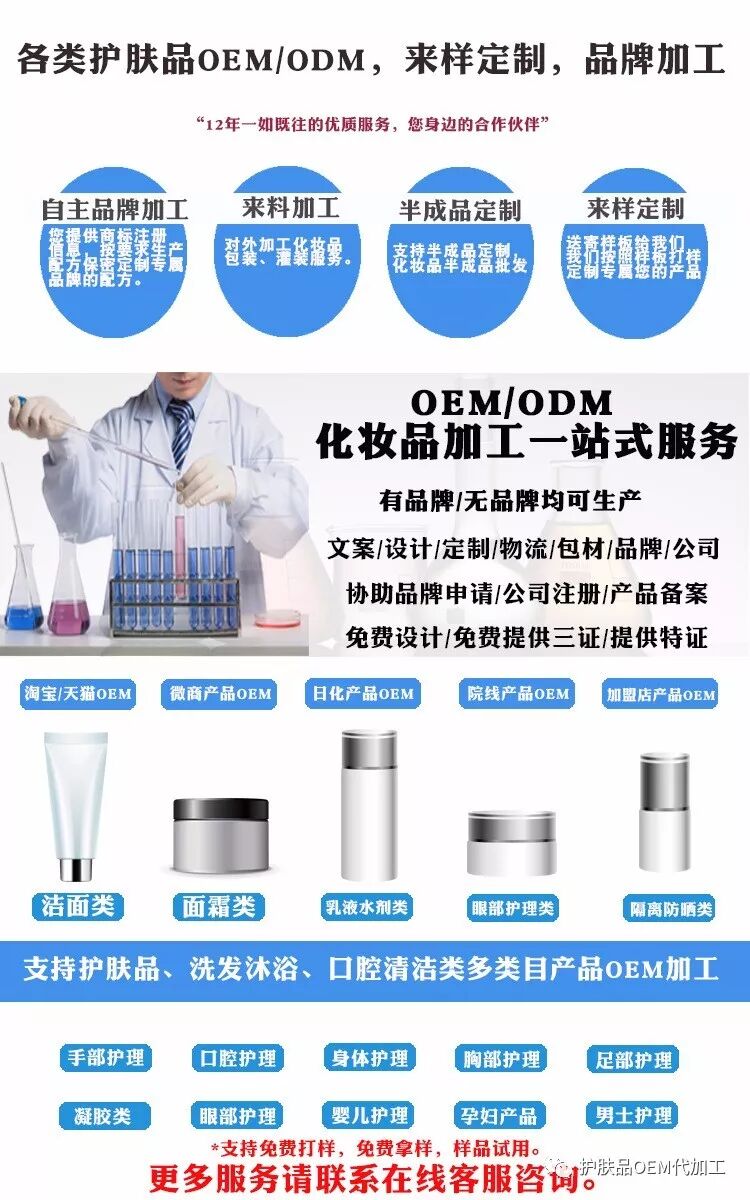 祛痘修护水OEM加工微信代加工厂 祛痘修护水OEM加工微商合作工厂,祛痘修护水OEM加工微商代工加工厂,祛痘修护水OEM加工美容院合作加工厂,祛痘修护水OEM加工合作企业,祛痘修护水OEM加工代加工厂,祛痘修护水OEM加工贴牌加工厂,广州祛痘修护水OEM加工工厂,广州祛痘修护水OEM加工合作企业,广州祛痘修护水OEM加工代加工厂,祛痘修护水OEM加工电商合作工厂。 有意联系广州蕴美化妆品有限公司 手机:18217829945 张琪 扣扣:3413873147 广州蕴美化妆品有限公司隶属于广州德芙集团旗下,是一个全新的现代化化妆品生产企业。工厂规模宏大、各类设备齐全、生产能力巨大。其建筑面积达30000平方米。工厂车间结构布局严格依照国家食药监局颁布的有关法规,设备采购、厂房规划建设均选择行业内的供应商和服务承包商,在节能环保、消防安全方面工厂也作出了巨大的投入。工厂常规膏霜产品日灌装能力15万支,面膜日产能为50万片。 祛痘修护水OEM加工一站式服务。张琪WENXI:182-1782-9945 扣扣:3413873147 祛痘修护水OEM加工适合对象: 3.专业美容院想做自己品牌,我们为您服务; 祛痘修护水OEM加工微信代加工厂联系方式: 咨询热线:182-1782-9945 张经理 商务在线洽谈:3413873147 生产厂家:广州蕴美化妆品有限公司 厂址:广州市白云区大岗领村横佰天168号 公司首页:https://shop3654631g47604.1688.com/ 祛痘修护水OEM加工微信代加工厂