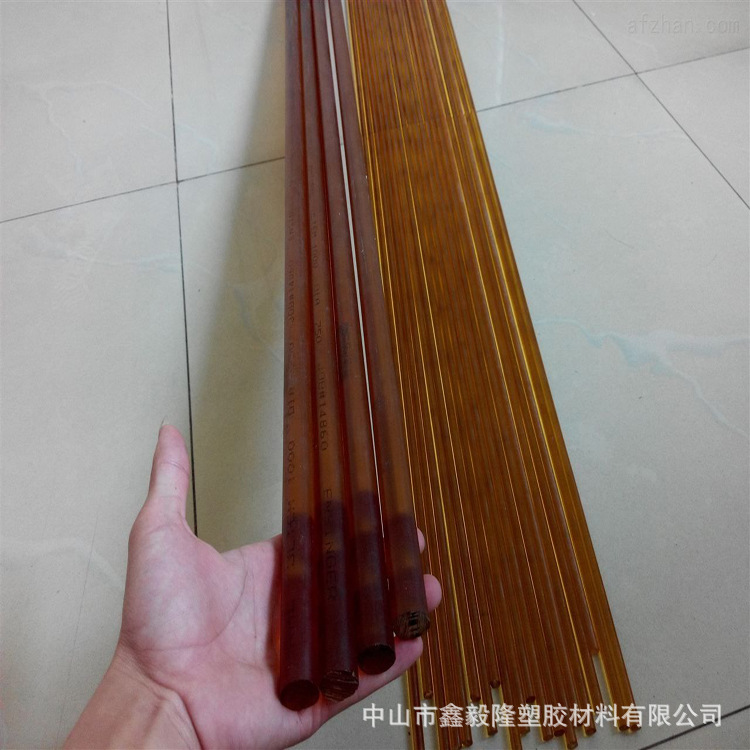 (1)PEI的特点是在高温下具有高的强度、高的刚性、耐磨性和尺寸稳定性。(2)PEI是琥珀色透明固体,不添加任何添加剂就有固有的阻燃性和低烟度,氧指数为47%,燃烧等级为UL94-V-0级。(3)PEI的密度为1.28~1.42g/cm3,玻璃化温度为215℃,热变形温度198~208℃,可在160~180℃下长期使用,允许间歇高使用温度为200℃。(4)PEI具有优良的机械强度、电绝缘性能、耐辐射性、耐高低温及耐疲劳性能和成型加工性;加入玻璃纤维、碳纤维或其他填料可达到增强改性目的。 外观[1] 琥珀色透明固体