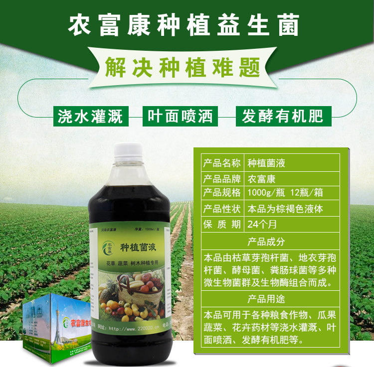 随着绿色有机农业的发展,减少甚至不用化肥、农药成为农业发展的一个趋势,使用益生菌也越来越多的用户所认可,那么农业使用益生菌有哪些作用,又该如何使用益生菌达到好的效果呢?农富康种植菌液在发展绿色有机农业中,有着很大的用途及很好的效果。对于土传病害的防治,使用愈早,效果愈好,从种源抓起,在作物育苗时应用,防病效果更佳。若作物一旦出现发病情况,须在农富康种植菌液日常使用基础上适当加大用量,控制病害蔓延! 150-3806-5301(李瑞) 农富康种植菌液含有大量功能性活菌、酶及其代谢产物,可以在植物的任何生长阶段使用,从发芽期开始使用效果佳。菌液中的光合菌群,不仅仅在叶子上,而且在土壤、在水中都可以利用太阳光能,它可以合成抗氧化物质,氨基酸、糖类和各种生理活性物质来促进植物的生长,还使土壤中的其他有益生物活跃壮大起来;抗氧化物质使用有机肥料不臭而散发出香味,使植物的根部活力加强,提吸收养分的能力。增强微生物,形成再生机制,溶解磷、钾、固氮,使能量立体化汇集,并改善土壤的酸、碱、粘、沙和易涝、易旱等不良性质。促进团粒化,提高土壤的保水和透气性能 1、农富康种植菌液富含活性功能型微生物、功能微生物的代谢产物、及其他多种营养成分,可明显促进幼苗的主根伸长和加粗,侧根增多,明显抑制幼苗期易患的“猝倒病”、“立枯病”等病害的发生,使作物出苗整齐、不烧苗、不徒长,尽快形成壮苗; 随着现在社会环境的污染太大,更随着人类环保与健康意识的提高,对无污染食品的需求也与日俱增。因此,在农业生产上,开辟新的生物有机肥,以减少甚至不用化肥,生产出高产、优质、高效的农产品已势在必行。 具体使用方法有看不懂的地方可随时咨询我公司技术人员