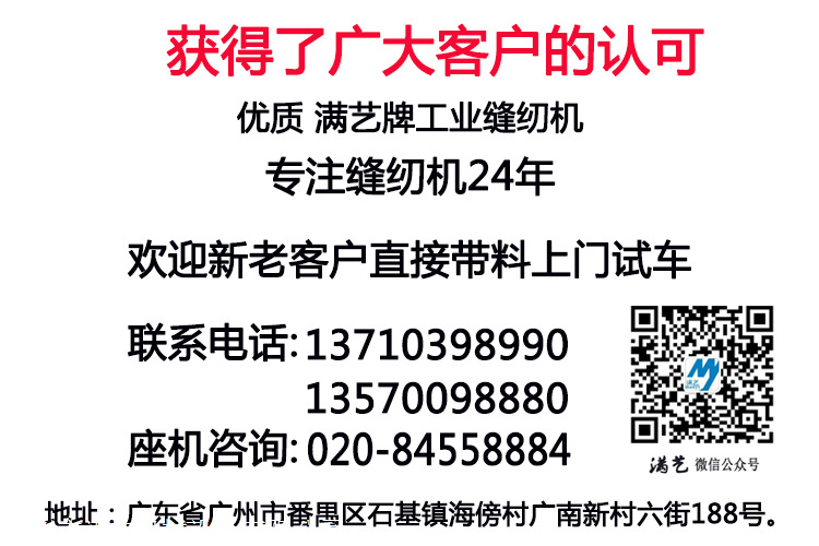 【 产品参数】 品牌:满艺牌 型号:MY-341 转速:2200S.P.M 针数:单针 针距长度:0-11mm 缝制空间:260x100mm 压脚高度:15mm 机针型号:DPX17 针杆行程:38mm 电机马达:下挂静音节能马达。 *节能、高效。 *在老款基础上车缝力度加大,线粗可至20股线(压脚提升高度加高2mm)。 *全自动循环供油润滑设计,大大降低零件的损耗,减少车缝时所产生的噪音。 *大针距设计,针距达10-12mm。 *新型设计可调试新款牙架,适用寿命大大加长。 适用于:箱包手袋的包边埋袋,运动用品,玩具,文具,等各种物料的车缝。 实体 24年行业经验 MY-341大嘴高车 汽车坐垫包边机 汽车脚垫工业缝纫机