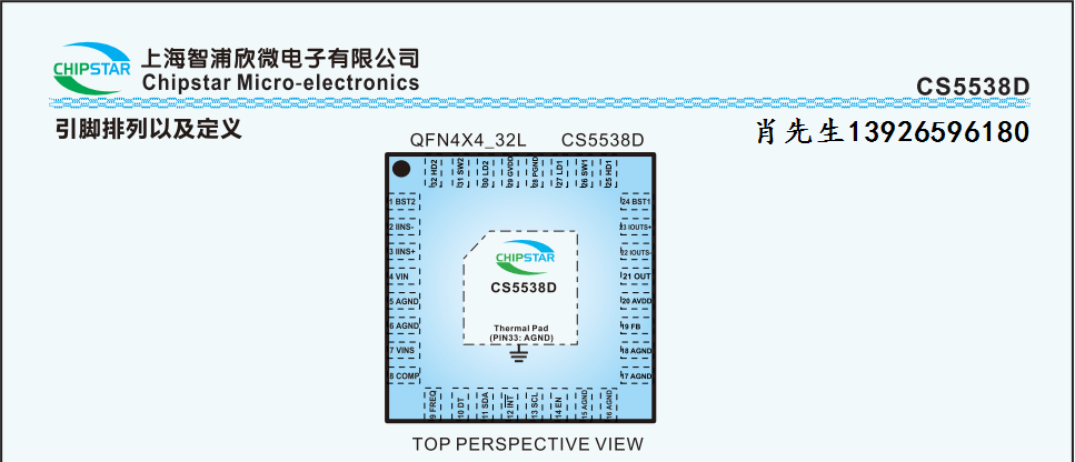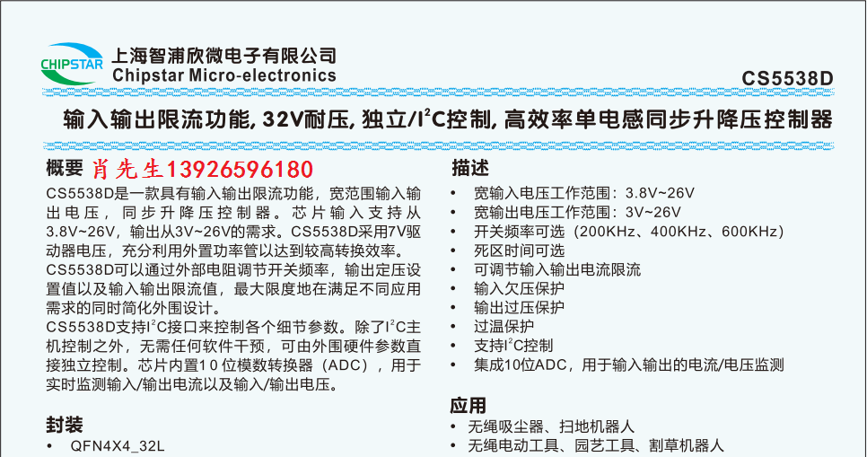 CS5538D是一款具有输入输出限流功能,宽范围输入输出电压,同步升降压控制器。芯片输入支持从3.8V~26V,输出从3V~26V的需求。CS5538D采用7V驱动器电压,充分利用外置功率管以达到较高转换效率。 CS5538D可以通过外部电阻调节开关频率,输出定压设置值以及输入输出限流值,在满足不同应用需求的同时简化外围设计。 CS5538D支持I?C接口来控制各个细节参数。除了I?C主机控制之外,无需任何软件干预,可由外围硬件参数直接独立控制。芯片内置10位模数转换器(ADC),用于实时监测输入/输出电流以及输入/输出电压。 产品应用:无绳吸尘器、扫地机器人无绳电动工具、园艺工具、割草机器人 ClassD音频功放:CS8126S,CS8126T,CS8138,CS8302,CS8122,CS8305,CS8121,CS8563,CS8528,CS8631,CS8618,CS8673,CS8623,CS8655,CS8611,CS8626,CS8676,CS86552,CS8118,CS8120,CS8212,CS8615,CS8622,CS8625,CS8677,CS8688,CS8679E,IU8632,IU8687,IU8689,IU86751,CS8685H,CS8683H,CS86756。 ClassR音频功放(内置升压):CS8323,CS8326,CS8330,CS8359,CS8395D,CS83601,CS83501,CS83702,CS83705,CS8389,CS8390,CS8316,CS8623,CS8316,CS8318,CS83785,CS83787, CS83711,CS8353,CS86552,CS8332,IU8373,IU8309,IU8395,CS8672,CS86817,CS86820,CS83828,CS8396,CS86706,CS83812,CS83815。 ClassAB/D音频功放:CS8139,CS8508,CS8508,CS8532,CS8571,CS8573,CS8575,CS8511,CS8576,CS8536,CS8736。 ClassGF音频功放(内置升压):CS5290,CS5250,CS5230,CS5260,CS5266,CS4230,IU8360T。 耳机功放芯片:CS4410,CS4420,CS4418,IU8200,IU8565,IU8202。 数字功放芯片:IU7189,IU7190,IU7191。 四声道音频功放:CS8725,CS8726。 ClassAB音频功放:CS8895,CS8898S,CS8591。 马达驱动:IU632,IU9019,IU9028,CS9016C,CS9020T,CS9018,CS9022E,CS9025,CS9027,CS9029。 DC-DC升降压:IU5706,CS57066,IU5708D,IU5180,IU5186,IU5516,IU5528,IU5530,IU5531,IU5536,IU5567,CS5503,CS5513R,CS5515R,CS5517T,CS5518T,IU5528D,IU5507T,IU5512,CS5523R,CS5525E,CS5711,IU5200D,CS5622,CS5538。 电源监控:CS803,CS809,CS810,CS811。 PWM控制器:CS6003S,CS6010S。半桥驱动:CS2103S。 同步整流控制器:CS6210R。打印机专用:IU91906。升降压充放电:CS5653。 DC-DC:IU5002,CS5005,CS5006,CS5025,CS5028,IU5051,IU5052,CS50363,CS5036,CS5038,CS5010,CS7120,CS2101,CS2102。 锂电池充电管理:CS5086,CS5082,CS5080,CS5090,CS5095,CS4056,CS5005,CS5036,CS5054,CS5801,CS5805S,CS5181,CS5305,CS5310,CS5315,CS5318,CS5918R,IU5096,IU5098,IU5918,IU5060,IU5062,IU5066,IU5925,IU5987T,IU5302,IU5306,IU5370,IU5380,IU5383,CS5601,CS5358,CS5256,IU5207,IU5208,IU5209,IU5071,CS5328,IU5365,CS5350,CS5363,CS5160,CS5359。