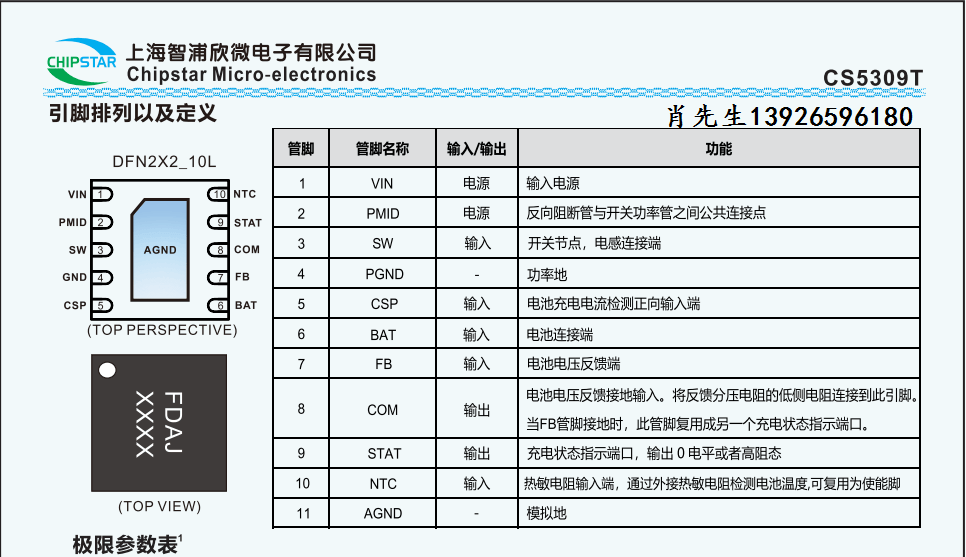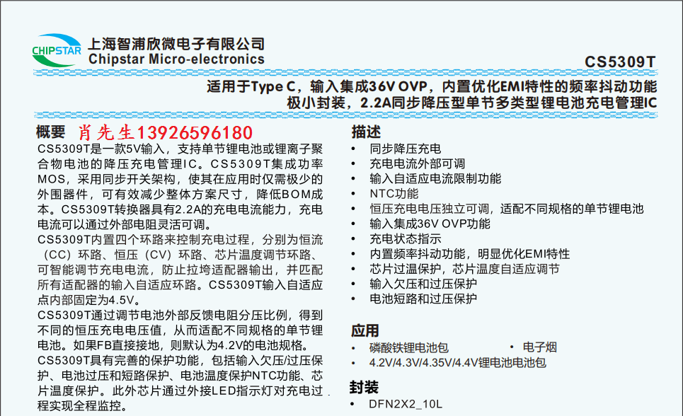 CS5309T是一款5V输入,支持单节锂电池或锂离子聚合物电池的降压充电管理IC。CS5309T集成功率MOS,采用同步开关架构,使其在应用时仅需极少的外围器件,可有效减少整体方案尺寸,降低BOM成本。CS5309T转换器具有2.2A的充电电流能力,充电电流可以通过外部电阻灵活可调。 CS5309T内置四个环路来控制充电过程,分别为恒流(CC)环路、恒压(CV)环路、芯片温度调节环路、可智能调节充电电流,防止拉垮适配器输出,并匹配所有适配器的输入自适应环路。CS5309T输入自适应点内部固定为4.5V。 CS5309T通过调节电池外部反馈电阻分压比例,得到不同的恒压充电电压值,从而适配不同规格的单节锂电池。如果FB直接接地,则默认为4.2V的电池规格。 CS5309T具有完善的保护功能,包括输入欠压/过压保护、电池过压和短路保护、电池温度保护NTC功能、芯片温度保护。此外芯片通过外接LED指示灯对充电过程实现全程监控。 ClassD音频功放:CS8126S,CS8126T,CS8138,CS8302,CS8122,CS8305,CS8121,CS8563,CS8528,CS8631,CS8618,CS8673,CS8623,CS8655,CS8611,CS8626,CS8676,CS86552,CS8118,CS8120,CS8212,CS8615,CS8622,CS8625,CS8677,CS8688,CS8679E,IU8632,IU8687,IU8689,IU86751,CS8685H,CS8683H,CS86756。 ClassR音频功放(内置升压):CS8323,CS8326,CS8330,CS8359,CS8395D,CS83601,CS83501,CS83702,CS83705,CS8389,CS8390,CS8316,CS8623,CS8316,CS8318,CS83785,CS83787, CS83711,CS8353,CS86552,CS8332,IU8373,IU8309,IU8395,CS8672,CS86817,CS86820,CS83828,CS8396,CS86706,CS83812,CS83815。 ClassAB/D音频功放:CS8139,CS8508,CS8508,CS8532,CS8571,CS8573,CS8575,CS8511,CS8576,CS8536,CS8736。 ClassGF音频功放(内置升压):CS5290,CS5250,CS5230,CS5260,CS5266,CS4230,IU8360T。 耳机功放芯片:CS4410,CS4420,CS4418,IU8200,IU8565,IU8202。 数字功放芯片:IU7189,IU7190,IU7191。 四声道音频功放:CS8725,CS8726。 ClassAB音频功放:CS8895,CS8898S,CS8591。 马达驱动:IU632,IU9019,IU9028,CS9016C,CS9020T,CS9018,CS9022E,CS9025,CS9027,CS9029。 DC-DC升降压:IU5706,CS57066,IU5708D,IU5180,IU5186,IU5516,IU5528,IU5530,IU5531,IU5536,IU5567,CS5503,CS5513R,CS5515R,CS5517T,CS5518T,IU5528D,IU5507T,IU5510,IU5512,CS5523R,CS5525E,CS5711,IU5200D,CS5622,CS5538,CS5567。 电源监控:CS803,CS809,CS810,CS811。 PWM控制器:CS6003S,CS6010S。半桥驱动:CS2103S。PoE控制器:CS7303,CS7305。 同步整流控制器:CS6210R。打印机专用:IU91906。升降压充放电:CS5653。 DC-DC:IU5002,CS5005,CS5006,CS5025,CS5028,IU5051,IU5052,CS50363,CS5036,CS5038,CS5010,CS7120,CS2101,CS2102。 锂电池充电管理:CS5086,CS5082,CS5080,CS5090,CS5095,CS4056,CS5005,CS5036,CS5054,CS5801,CS5805S,CS5181,CS5305,CS5310,CS5315,CS5318,CS5918R,CS5926,IU5096,IU5098,IU5918,IU5060,IU5062,IU5066,IU5925,IU5987T,IU5302,IU5306,CS5309,IU5370,IU5380,IU5383,CS5601,CS5358,CS5256,IU5207,IU5208,IU5209,IU5071,CS5328,IU5365,CS5350,CS5363,CS5160,CS5359。